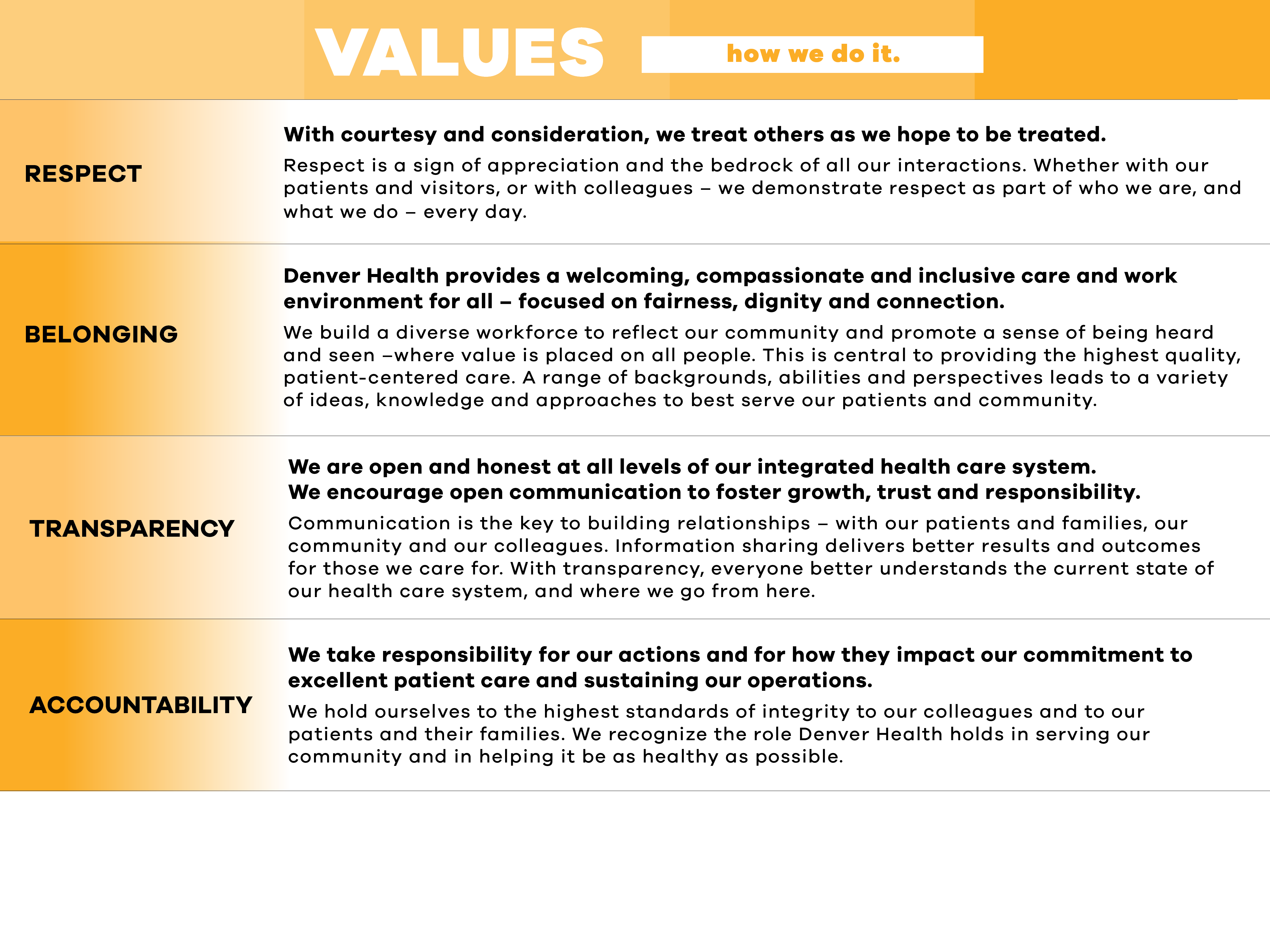 Denver Health strives to change the world by transforming the health of our patients and community. Our values are: